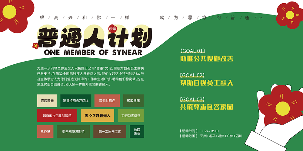 為進一步傳播針對自強員工的“尊重”文化,引導全體思念人積極踐行“尊重”文化,展現對自強員工的關懷與支持,在第32個國際殘疾人日來臨之際,思念食品組織開展了面向全國各生產基地的自強員工關愛活動,號召全體思念人為他們營造無障礙的工作和生活環境,助推他們穩崗就業,在思念實現自我價值,和大家一樣成為思念的普通人。